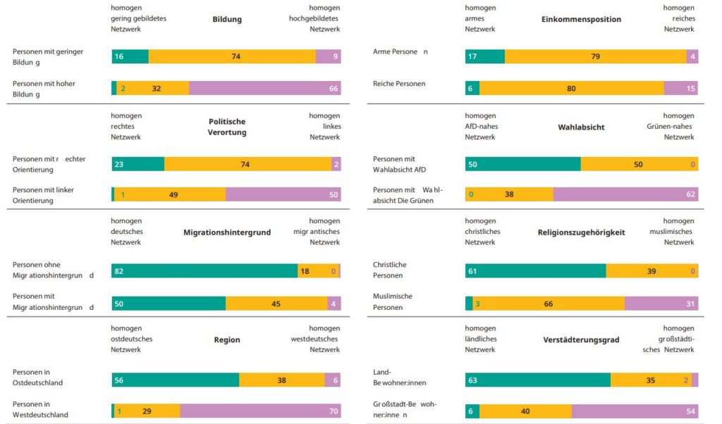 Unsere Studie zeigt, inwiefern sie unabhängig von bzw. zusätzlich zur individuellen Gruppenzugehörigkeit auch mit der Homogenität sozialer Netzwerke zusammenhängen. Dabei zeigen sich unterschiedliche Effekte für die von uns untersuchten homogenen Netzwerke.